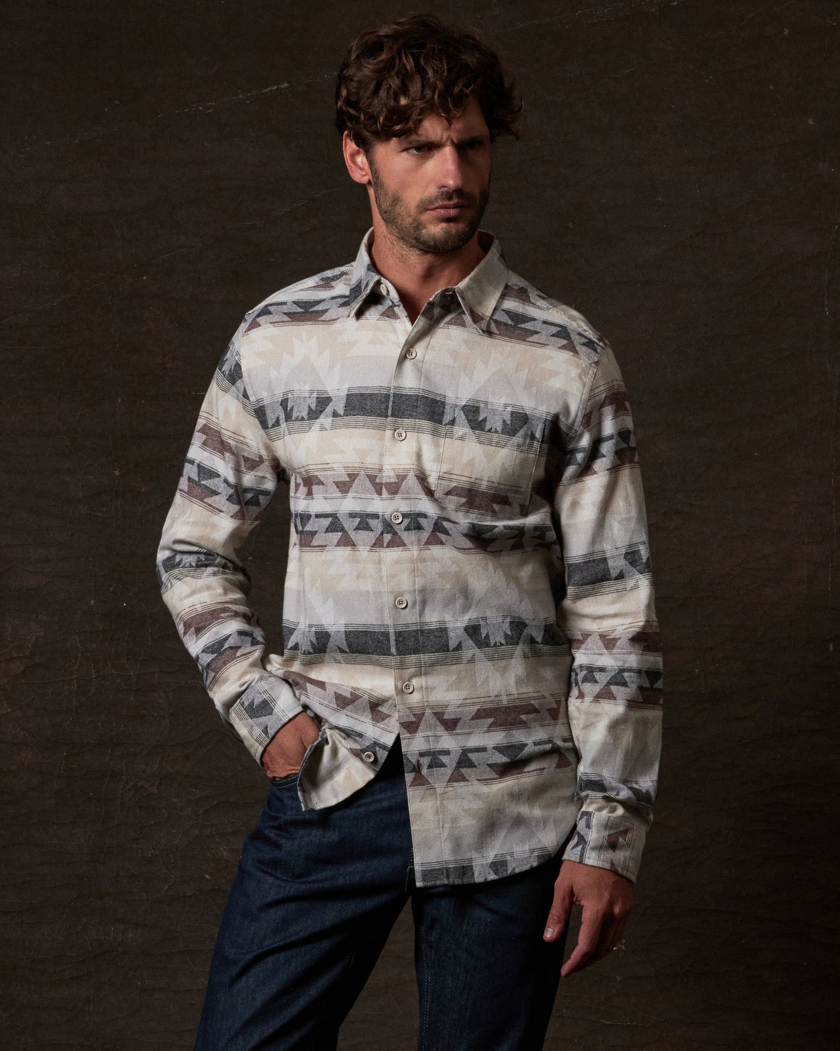 A standout layer, this Southwest-inspired over-shirt is crafted in 100% cotton jacquard for a bold yet versatile look. Lightweight but warm, it’s designed for easy layering through the cooler months.