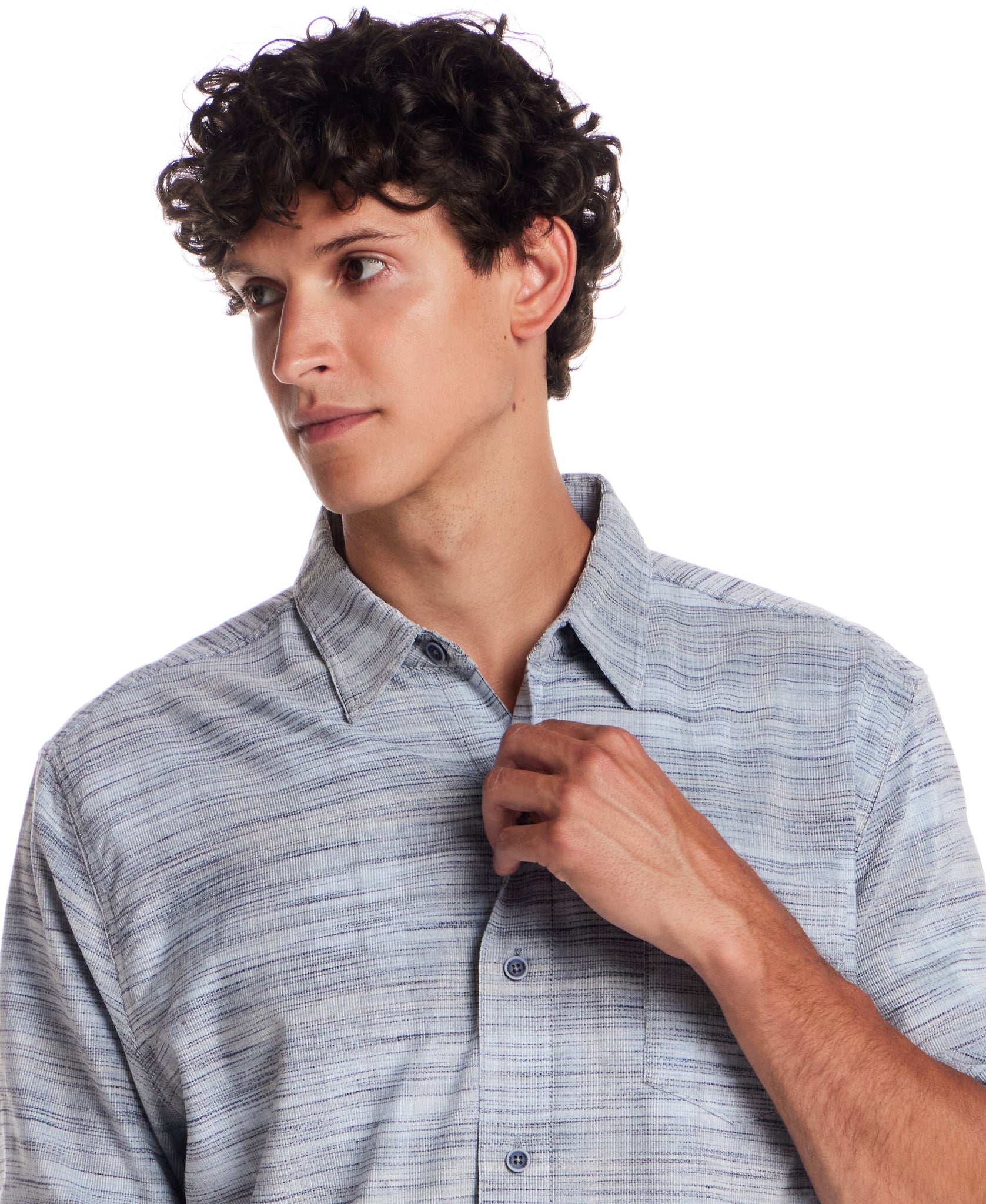 Detail: Point collar, single chest pocket, button-cuffed sleeves