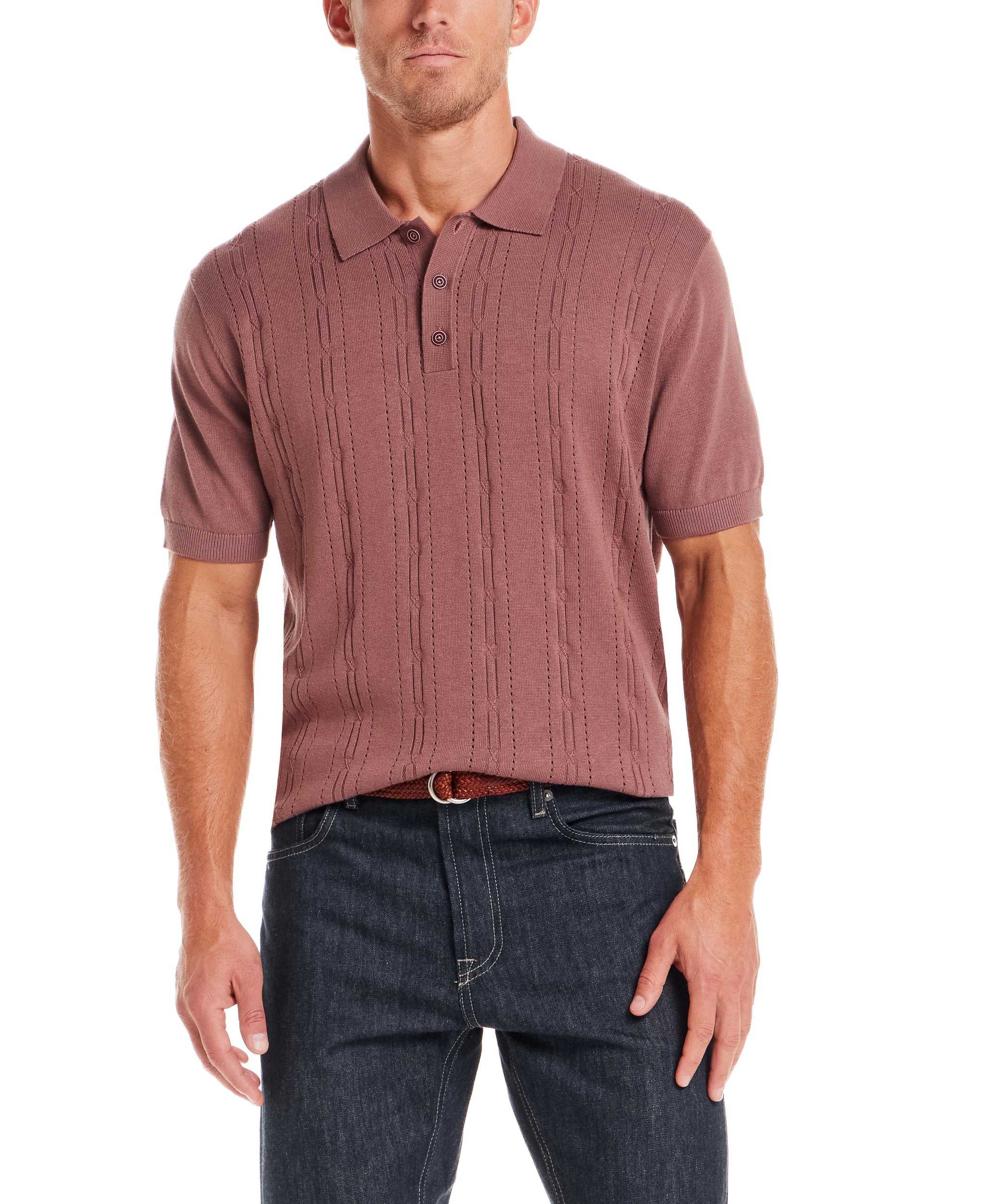Detail: Pointelle knit, three-button placket, classic polo collar, ribbed cuffs and hem.