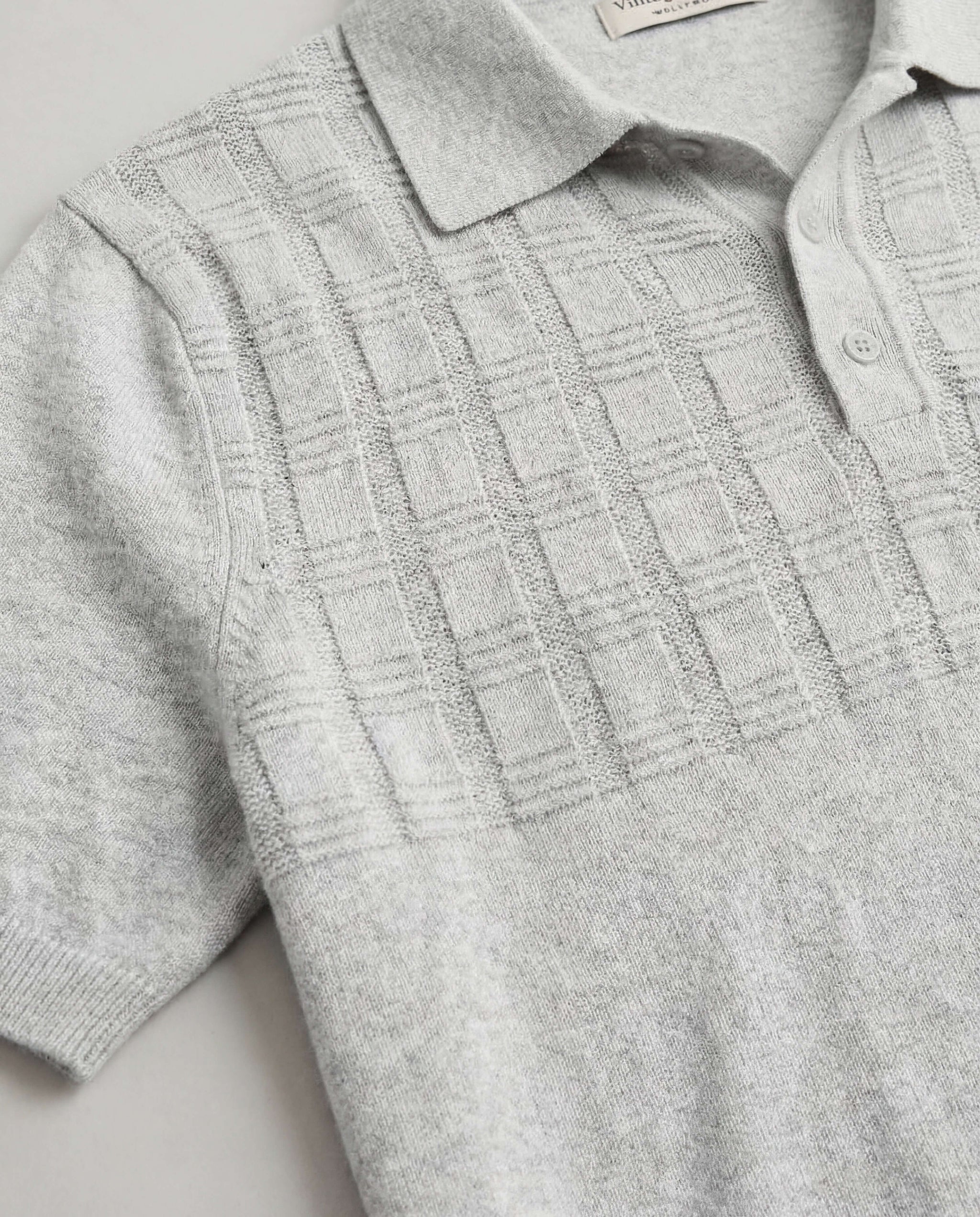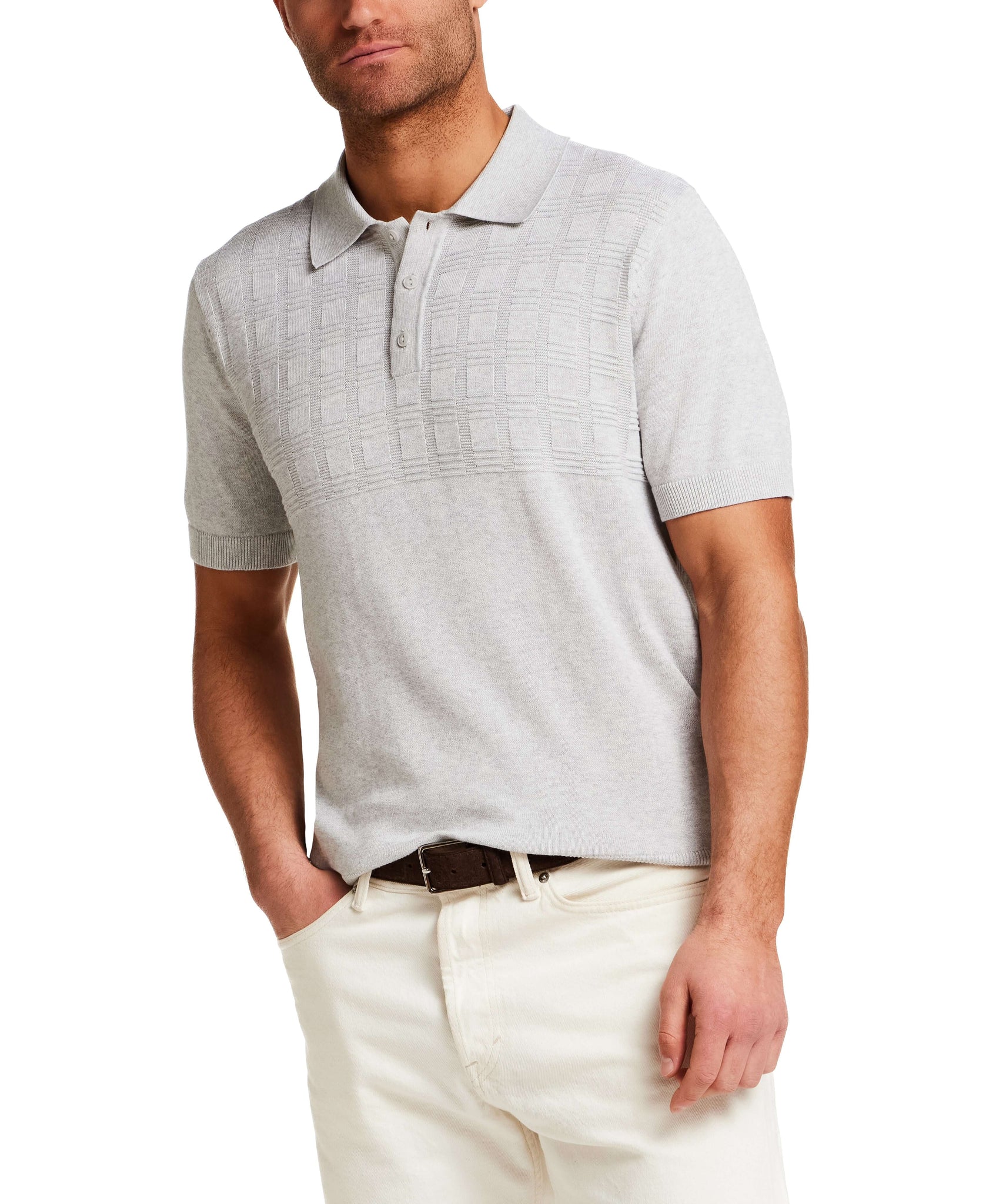 This short sleeve knit polo features a subtle grid panel across the chest, adding quiet dimension to a minimal silhouette. Crafted from 100% cotton with a smooth, breathable feel and finished with a three-button placket and ribbed trim for soft structure.