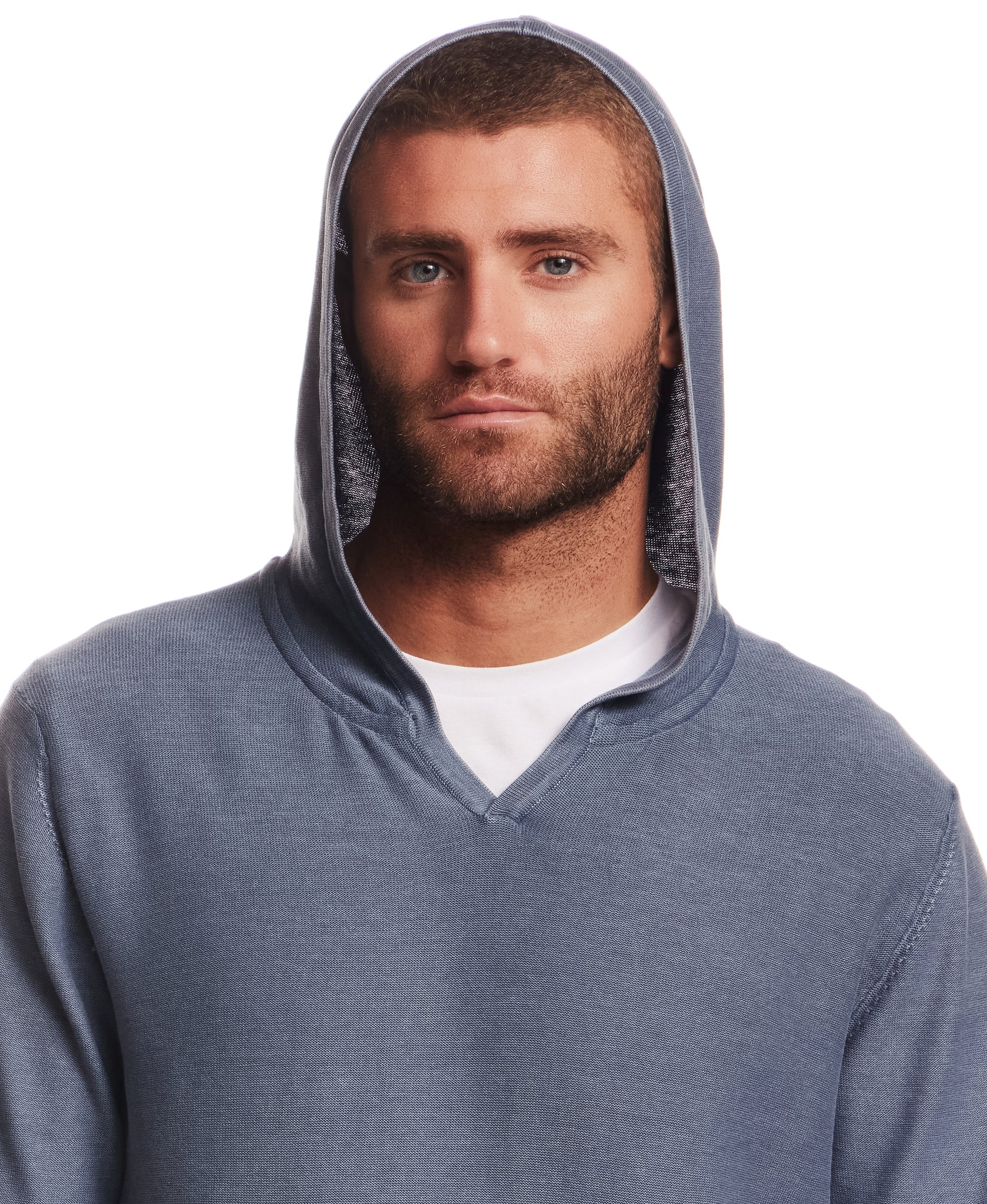 Detail: Soft stone-washed finish, V-neck hood, kangaroo pocket, rib trim at hem and cuffs.