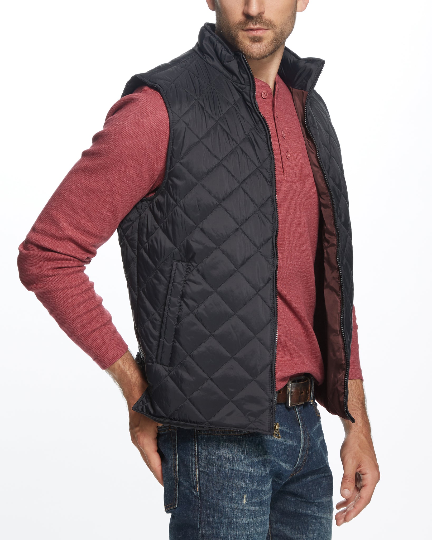 - Detail: Quilted lightweight padded insulation, windproof, zip up front, hand warmer pockets, interior chest pocket, contrasting burgundy lining, imported