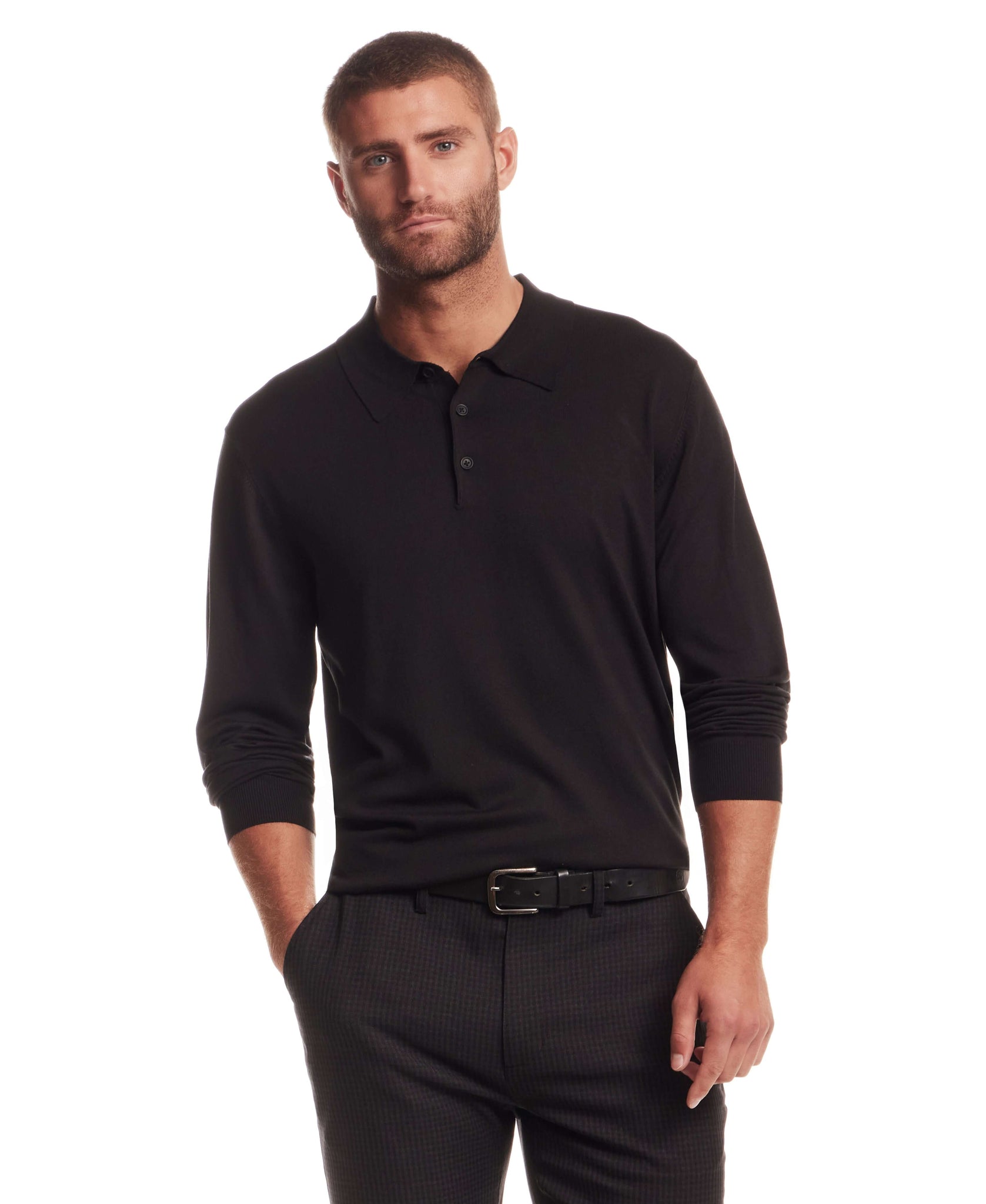 Soft and lightweight, this long sleeve polo sweater is an effortless addition to your fall wardrobe. Its refined knit and clean silhouette make it ideal for layering or wearing on its own for a polished casual look.
