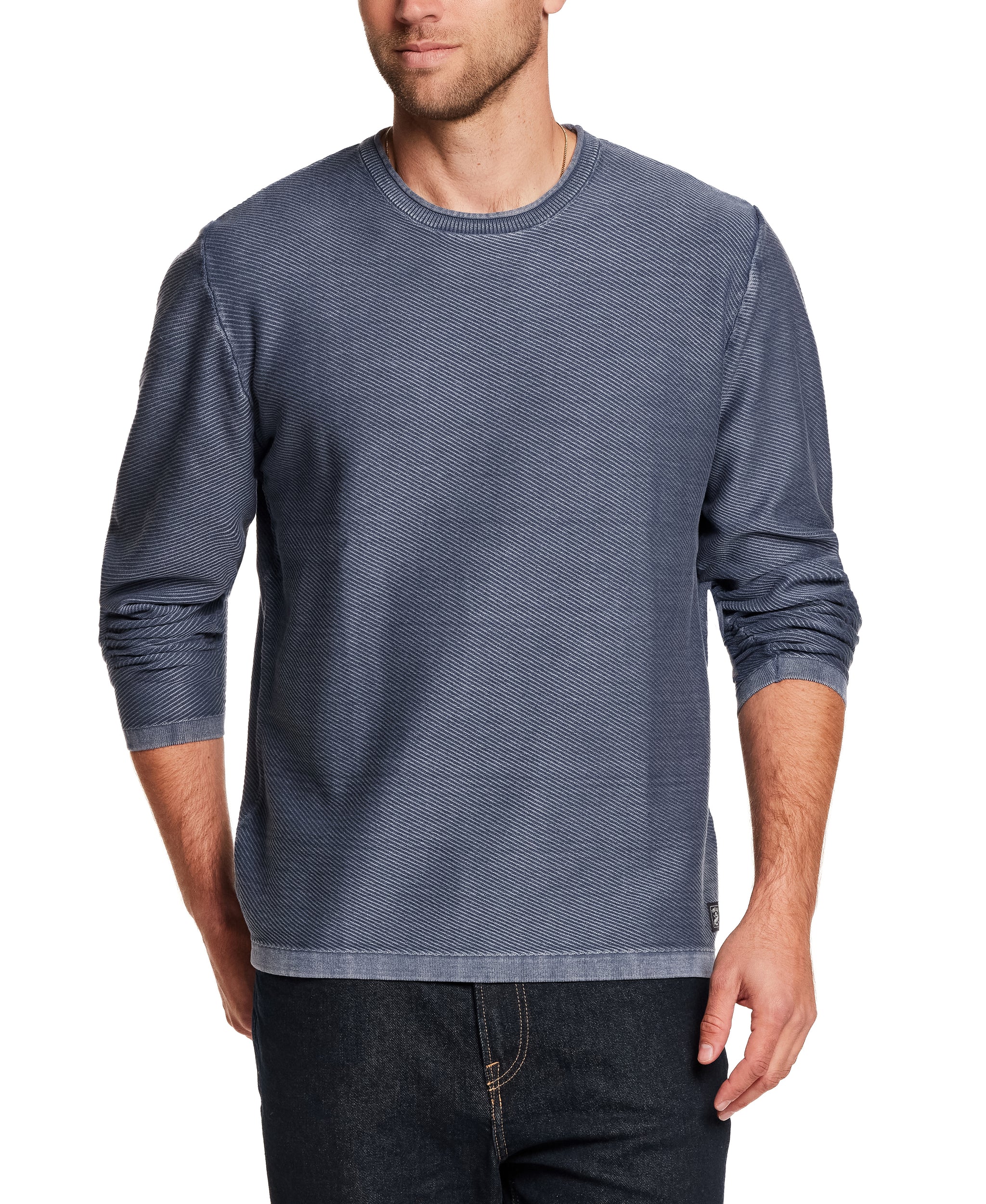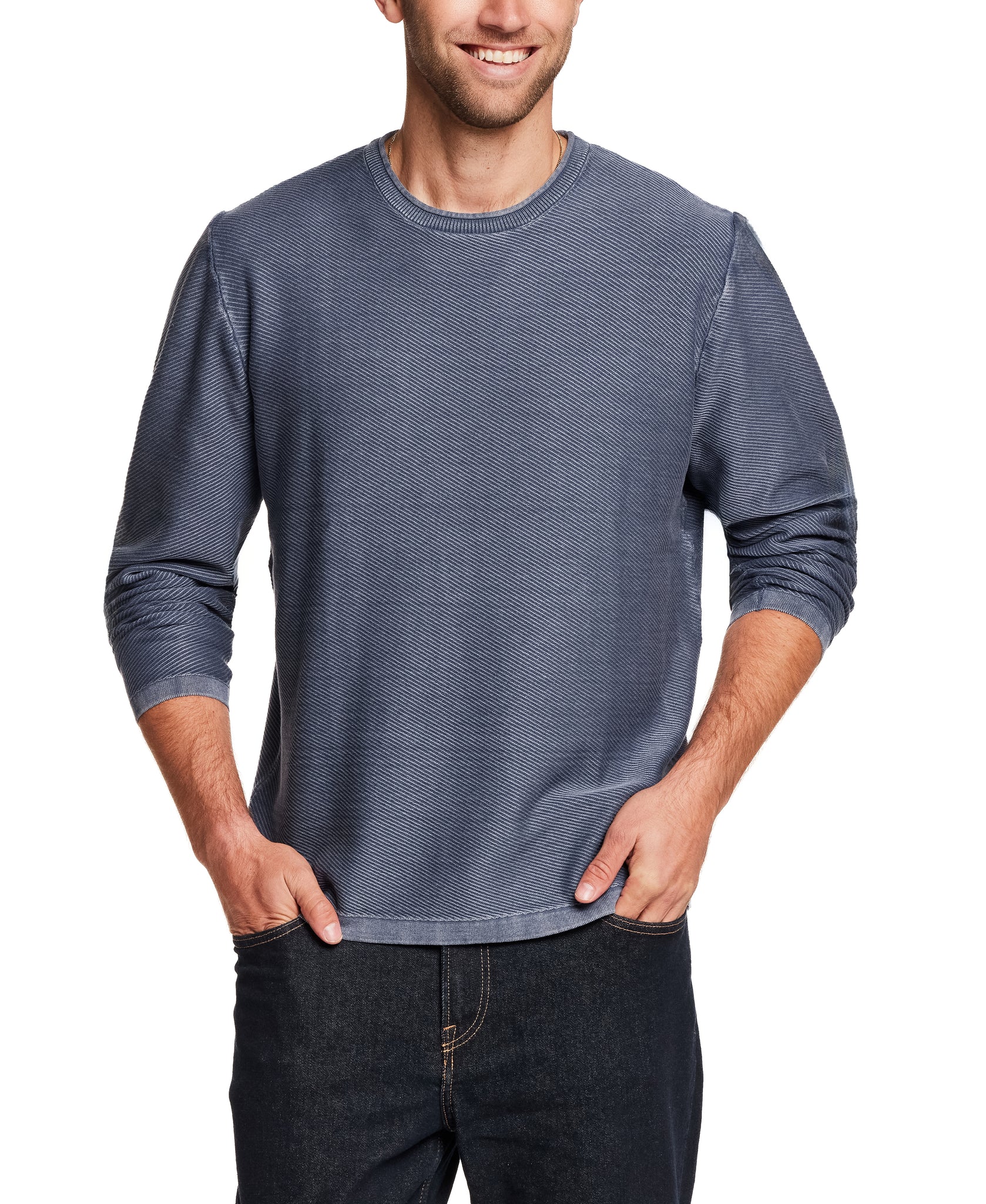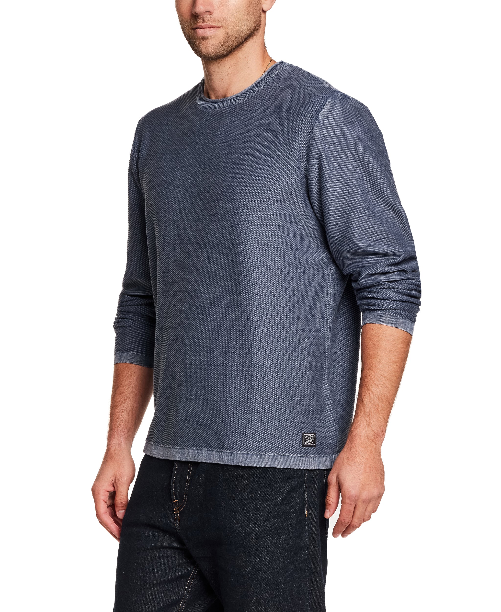 Designed as an easy to wear, transitional sweater., this will be your go-to year-round crew. Our cotton yarn is super soft but not overly warm and knit in an airy, twill stitch giving the sweater dimension and texture. It's then garment-dyed and washed for a lived in, vintage look and feel that's casually cool for any occasion.