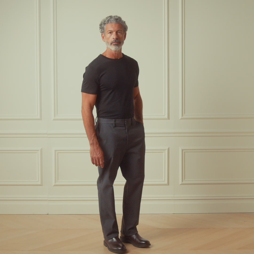Tailored pants with a subtle grid pattern, designed to add modern refinement to any outfit. The stretch-blend fabric offers comfort and ease of movement, making them ideal for both work and casual wear.