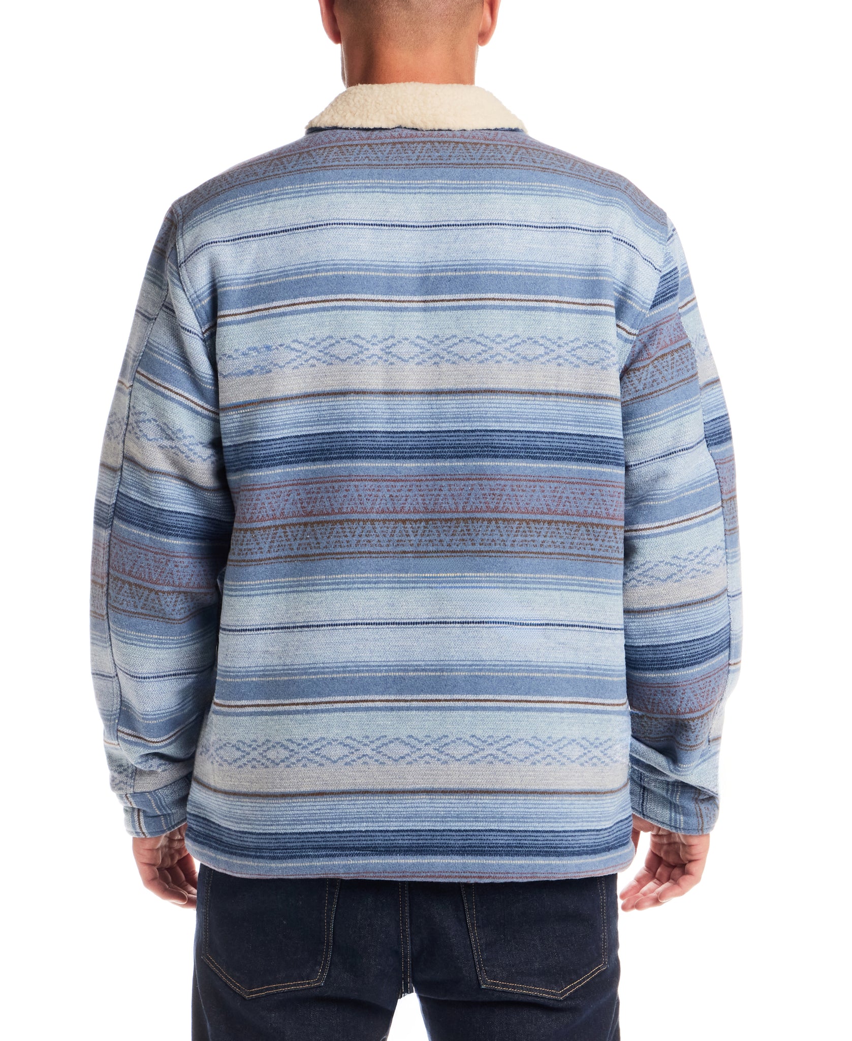 A standout cold-weather layer, this rancher jacket combines bold Southwest-inspired patterning with a warm Berber-lined interior. Designed for insulation and comfort, it features a zip front, snap-flap pockets, and a soft sherpa collar to lock in warmth on colder days.