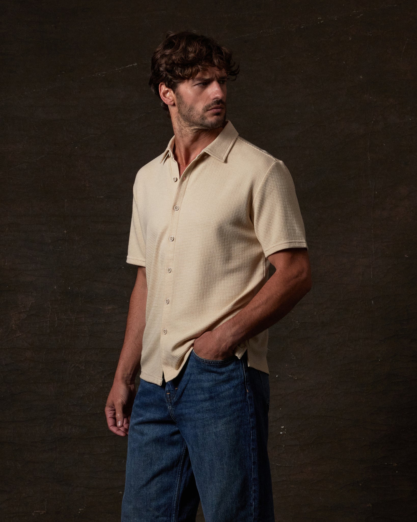 A soft stretch waffle knit brings comfort and subtle texture to this short sleeve shirt, designed with a relaxed fit and modern ease. A versatile piece for casual or layered looks.