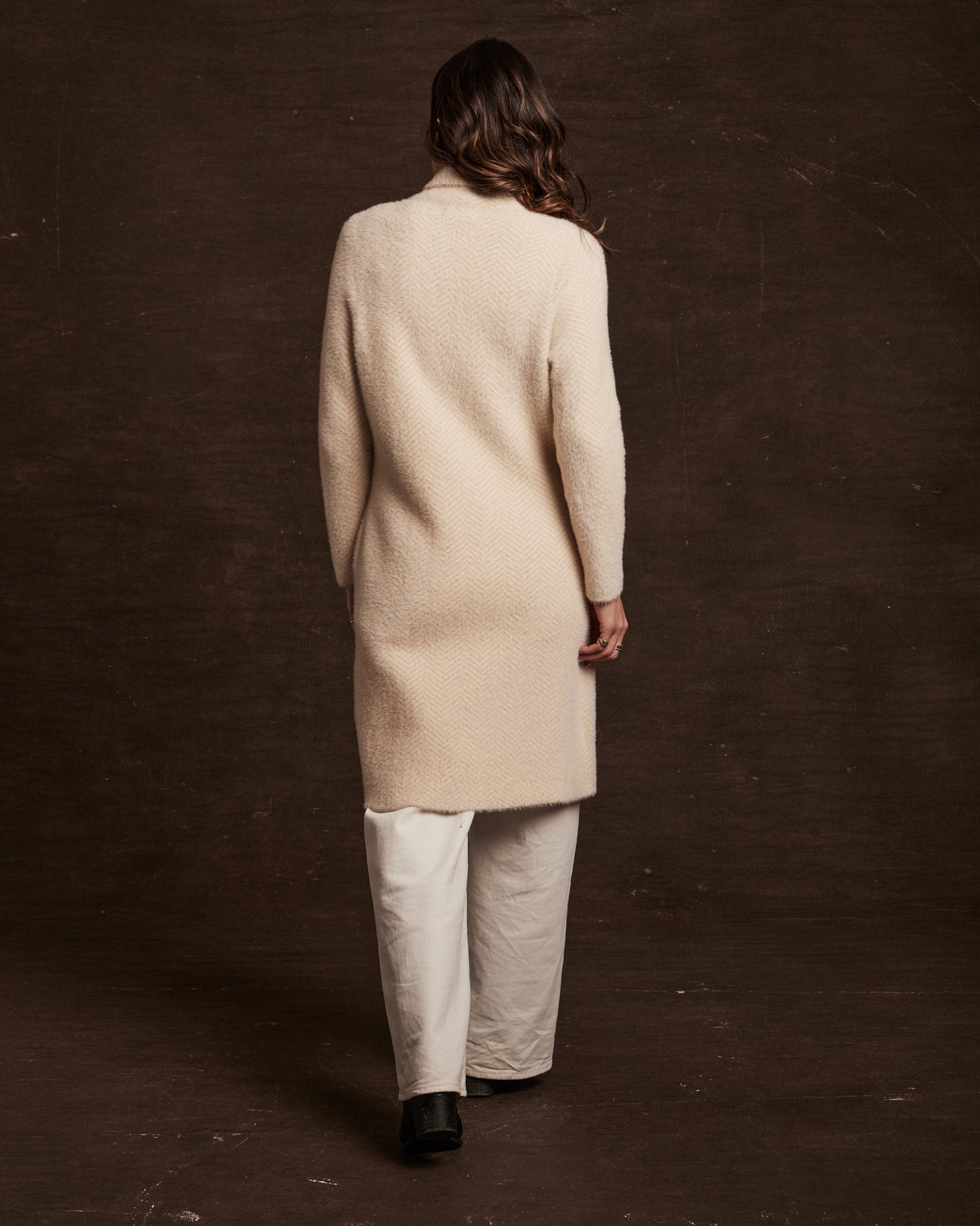 A soft, sophisticated sweater-coat with a subtle sheen and timeless two-tone herringbone design. Finished with a notched collar and patch pockets for a polished yet easy look.